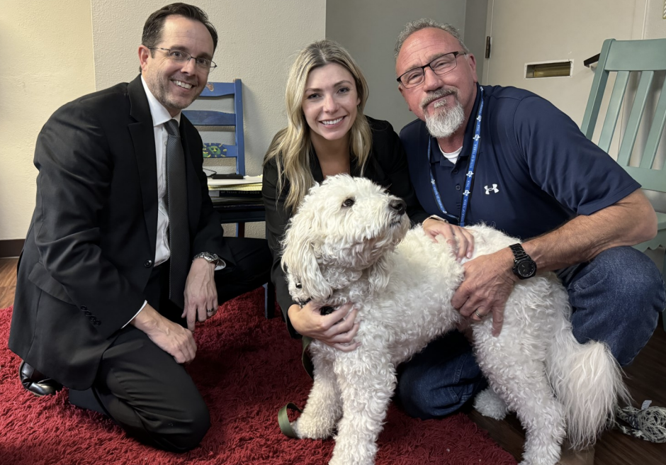 Pictured below are the prosecutors of this case, Ryan Calvert and Alyssa Killin, and investigator Keith Kunz, with Mandy Reynolds’ dog, Titan.