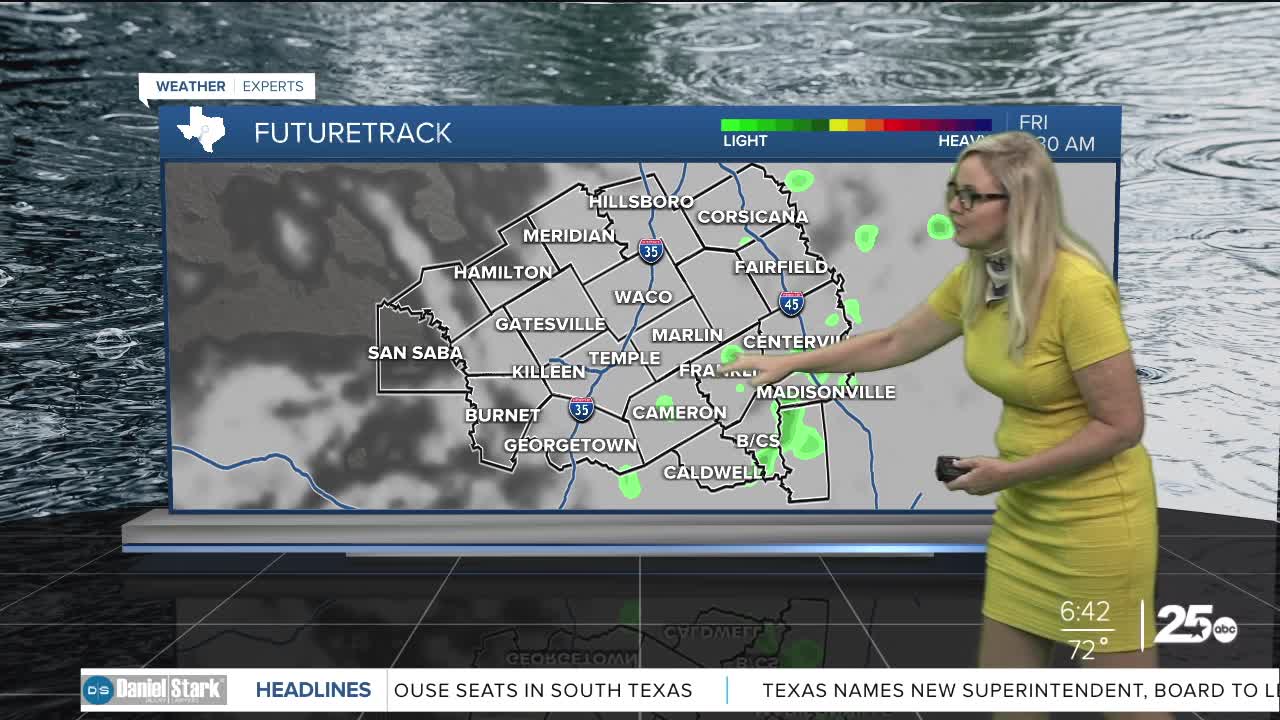 CENTRAL TEXAS — Temperatures continue to rise as we move from a misty Friday morning into a partly cloudy afternoon. Expect highs to reach the mid 80s to low 90s. These hot conditions along with a dry line to the west, and an unstable atmosphere, could produce an isolated storm strong enough to break the cap. If that happens the storm would be strong to severe. The biggest threat with a severe storm outbreak would be tennis ball sized hail and strong winds. The opportunity for flooding and a tornado remains very low. Outside of the low possibility for a storm, we will see mostly misty and cloudy skies in the morning. Then as we move toward lunchtime the clouds will decrease.
