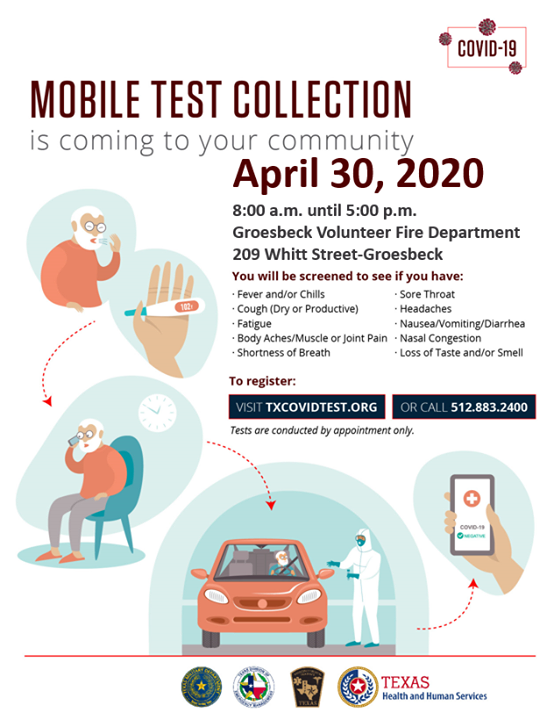 A COVID-19 mobile test site will be held for Limestone County on Thursday, April 30th from 8:00 a.m. until 5:00 p.m. at the Groesbeck Fire Department located at 209 Whitt Street.