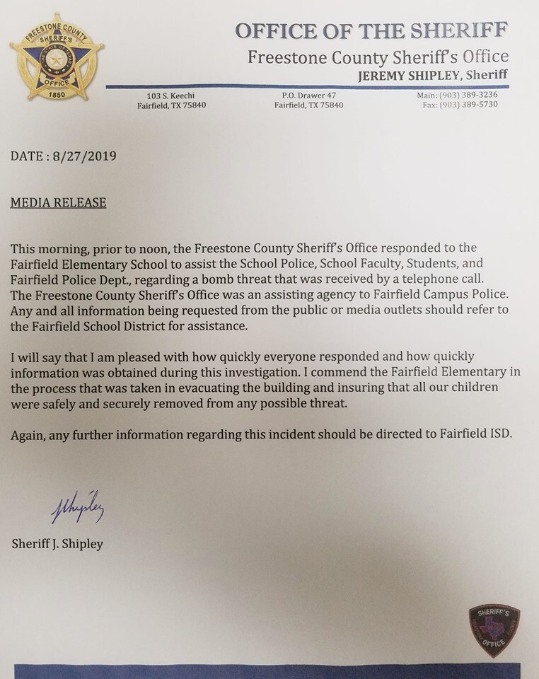 The Freestone County Sheriff's Office responded to the scene to assist Fairfield ISD police, Fairfield police, and Fairfield Elementary faculty and students.