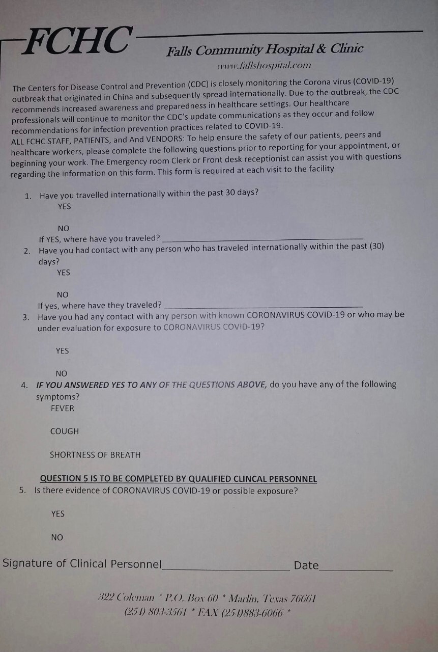 Falls County Community Hospital apologizes for any inconvenience but asks that "everyone do their part in helping to halt the potential spread of COVID-19."