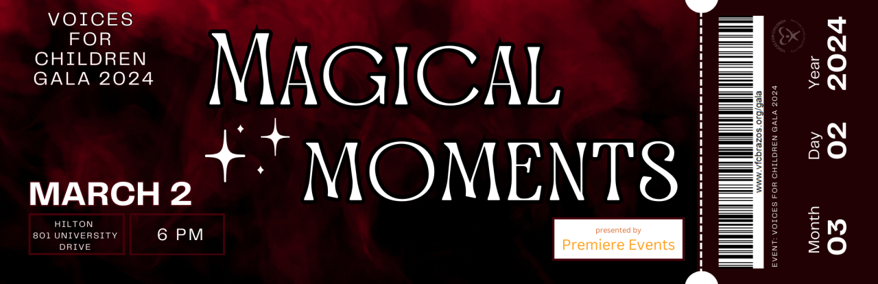The honorees will be recognized at the Voices for Children Magical Moments Gala, presented by Premiere Events, on Saturday, March 2, 2024 at the Hilton College Station & Conference Center. The Gala is Voices for Children's largest annual fundraising event. The event will feature a performance by Puck the Magician, and includes dinner, drinks, silent and live auction, raffle and more. The Gala brings together a community committed to the mission of advocating for safe and permanent homes for children in the foster care system. Sponsorship opportunities for the event are available; please visit www.vfcbrazos.org/gala for more information.