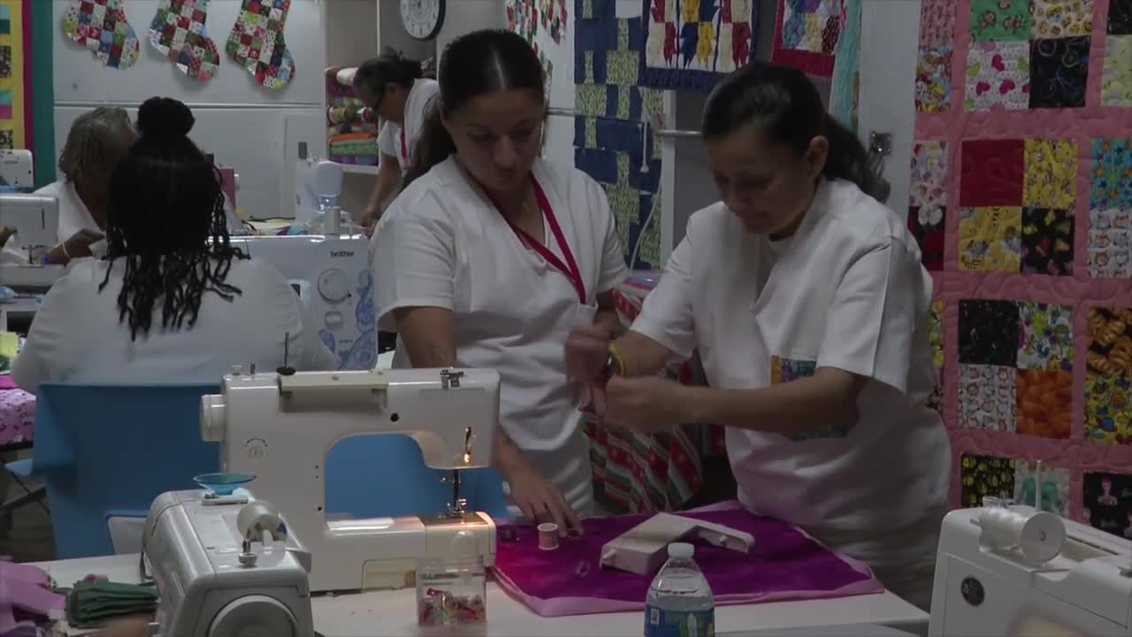“We’ve donated so far 40 quilts to foster care and 30 pillow cases that we’ve made into bags. It’s been very rewarding, especially once they’ve made those quilts and then we got to present them to the people for CPS and it was great,” said Hobby Unit laundry manager Terri Speer.