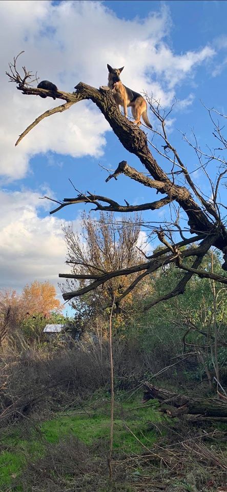 LATHROP, CA — This German shepherd bit off more than he could chew when he chased a cat up into a tree on Saturday.