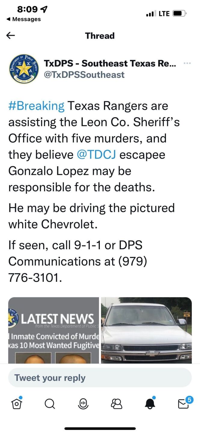 "It is believed that escaped inmate, Gonzalo Lopez, may be driving the vehicle and may be armed," the TDCJ post said.