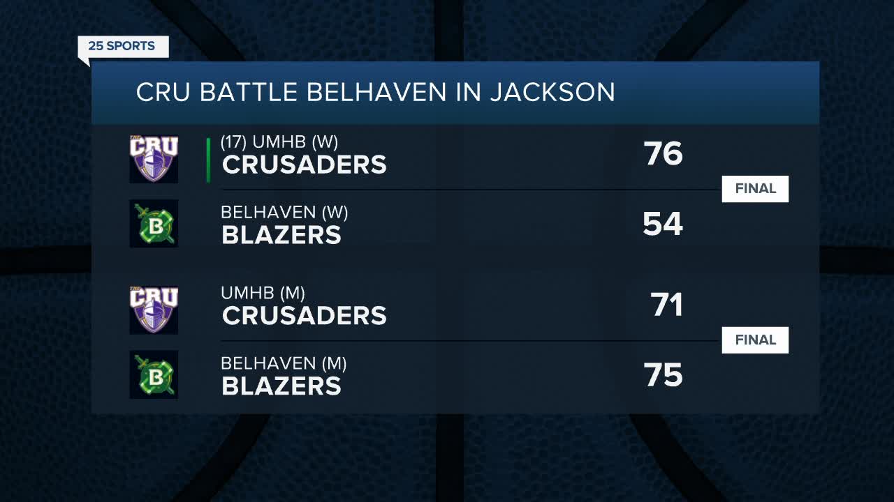 Belhaven led 53-44 with 12:41 left to play, but UMHB fought back to cut it to 57-56 three minutes later. The Blazers scored the next seven points to push it back to an eight-point advantage. The Cru battled back to within three points on two occasions before Belhaven retook a nine-point lead with 2:54 remaining. Kendal Little hit a three-pointer and Logan Hicks added five straight points following a Blazer free-throw to cut it to 73-71 with 30 seconds left. Belhaven was able to get Brosnan Cooks loose for a lay-up with 11.6 seconds to go and UMHB could not answer. The Blazers opened the game with a 13-2 spurt before the Cru fought back to cut it to 34-29 at halftime.