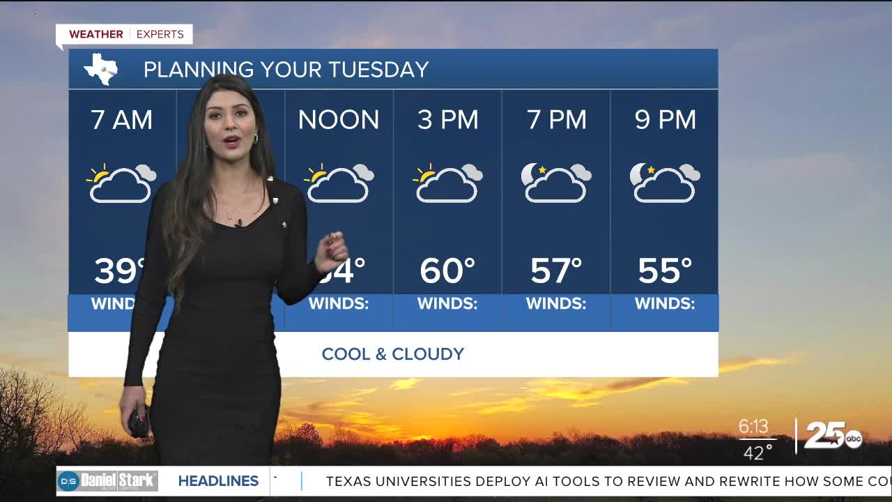 Morning temperatures were in the upper 30s and lower 40s this morning. For today, we will track a more mild Tuesday afternoon with increasing clouds. Today's highs will feature lower to middle 60s under mostly cloudy skies. Winds out of the south will be breezy and will range from 10-15 mph.