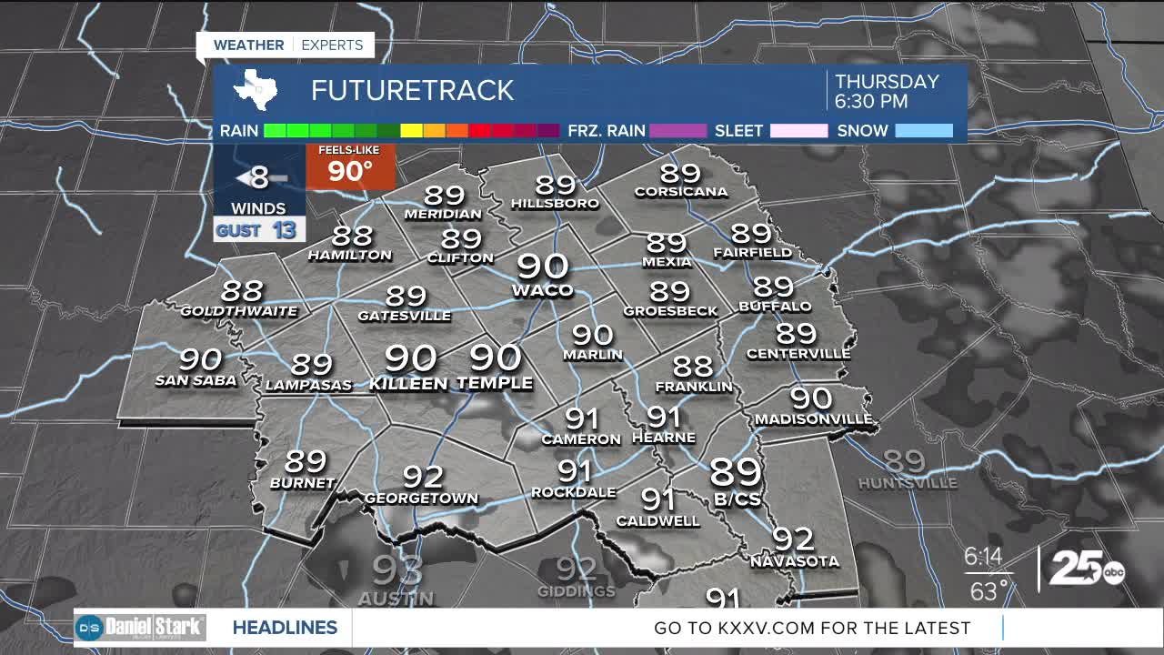 CENTRAL TEXAS — Good morning! We're waking up to temperatures in the 60s. We'll warm into the mid 90s today as sunshine continues to fill the sky. Today will likely be the warmest of the week and of the next 10 days. A weak area of low pressure in the Gulf will send a bit more clouds our way this weekend, but only enough to make it partly cloudy. Even so, that will be enough to push temperatures in the low 90s.