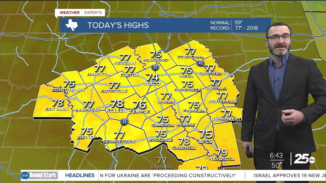 CENTRAL TEXAS — Morning clouds will erode to some sunshine this afternoon as south winds pump in warmer air pushing highs to the mid 70s. Expect the warm weather to hang around into the holiday as well!