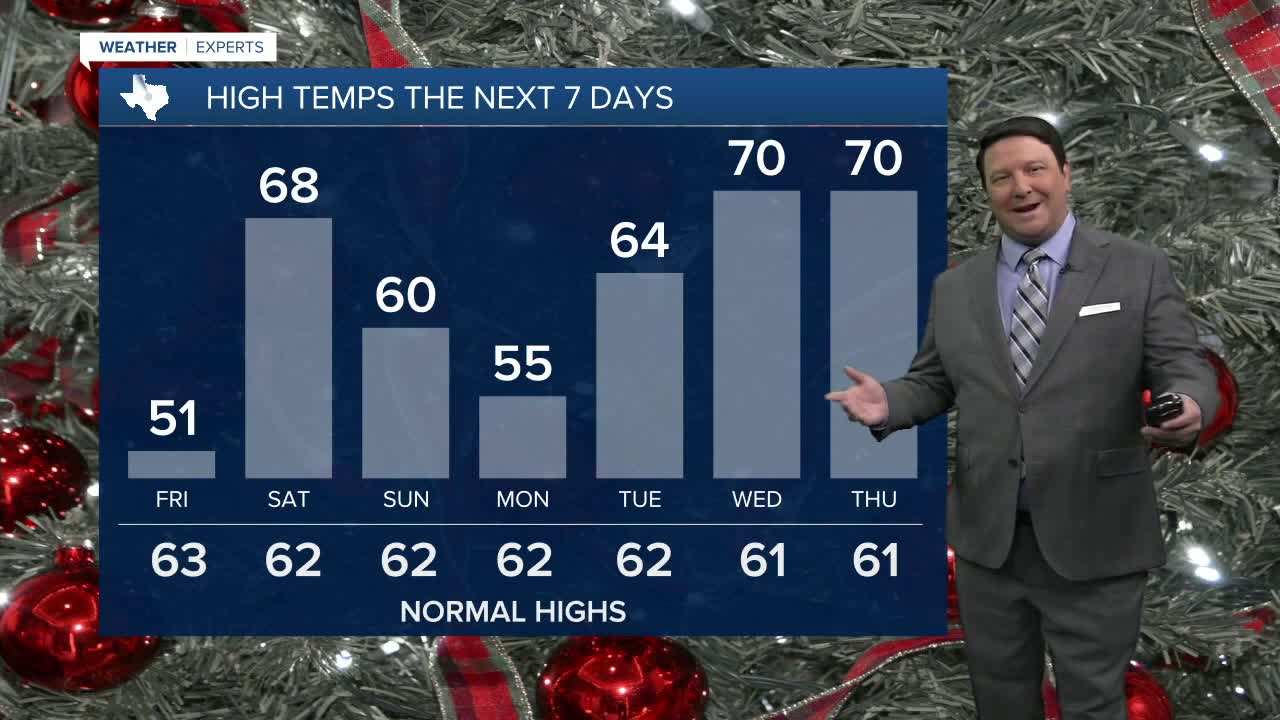 25 EVENING WEATHER — It will be chilly tonight with clouds and patchy areas of drizzle. Lows will fall into the upper 30s and low 40s in the morning. Friday, the clouds stick around with a few showers, especially across the southern and eastern parts of Central Texas. Highs will be in the upper 40s and low 50s east and mid to upper 50s west where you could see a few peeks of sun.