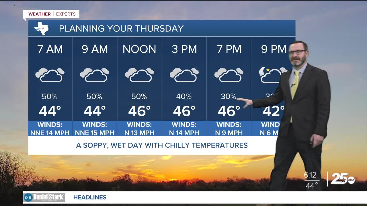 CENTRAL TEXAS — Highs will only climb into the mid to upper 40s today as chilly weather hangs around along with widespread drizzle. Cloudy and cool weather stays in place Friday as well.