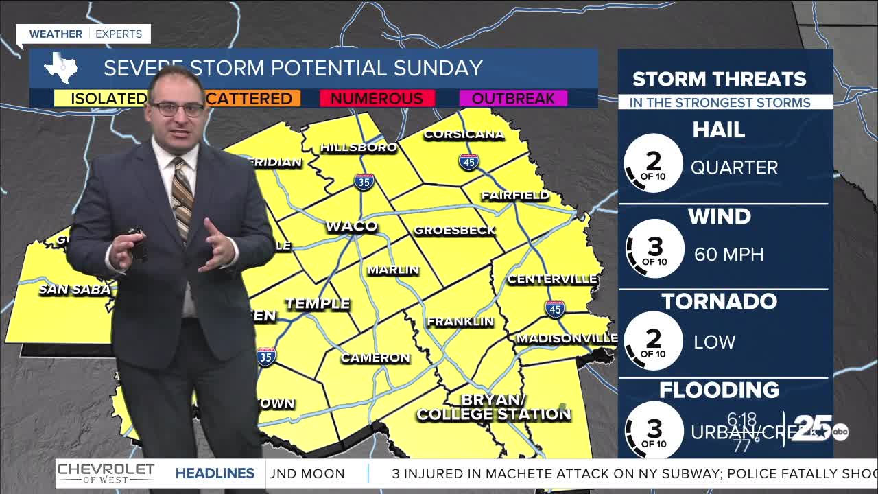 CENTRAL TEXAS — We inch closer towards a tricky forecast that calls for thunderstorms and a low-end severe weather chance for Central Texas on Sunday.