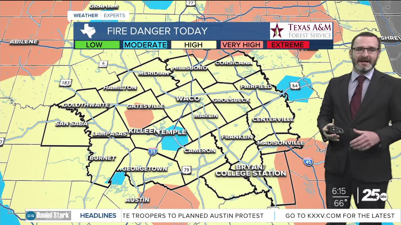 CENTRAL TEXAS — Highs will climb in the low 90s thanks to the south winds turning gusty again. That combined with drier air will lead to a high fire danger.