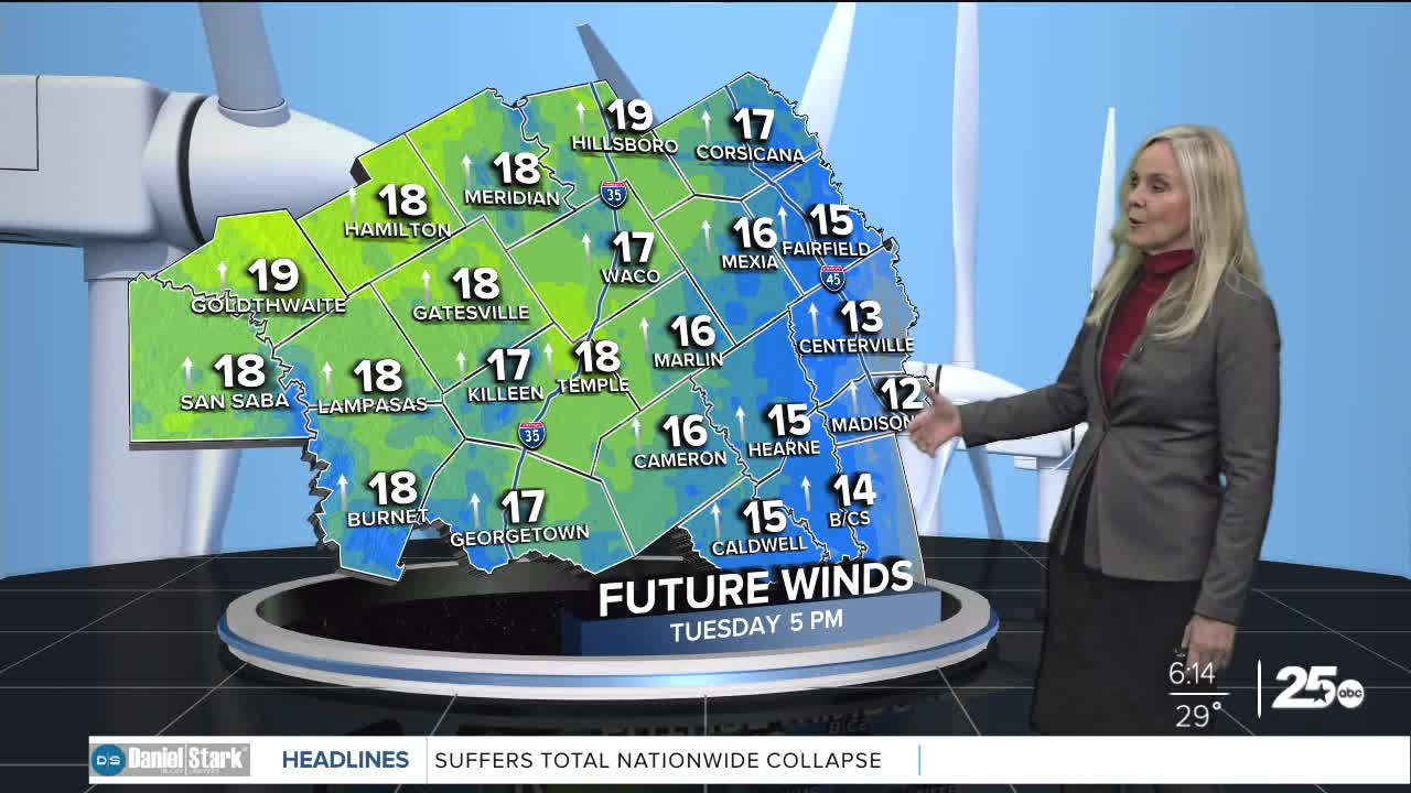 The positive news this morning is the lack of wind power. The low and high pressure systems that were sandwiching Central Texas have separated significantly. This has created space between the pressure gradients and eased the wind speeds. Today we will have an occasional light breeze, with a southerly flow of around 15 mph this afternoon.