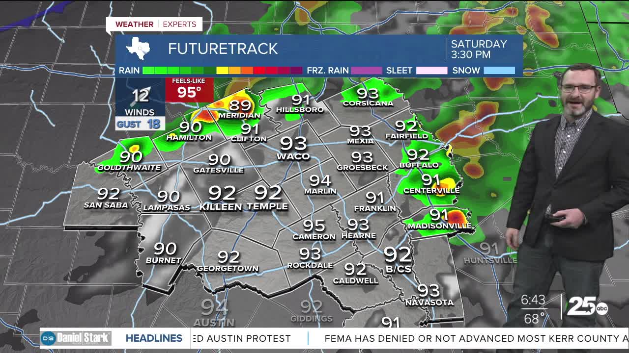 CENTRAL TEXAS — Highs will climb into the low 90s Friday with partly cloudy skies. Rain chances will return Saturday with a cold front that will bring a more seasonable Sunday.