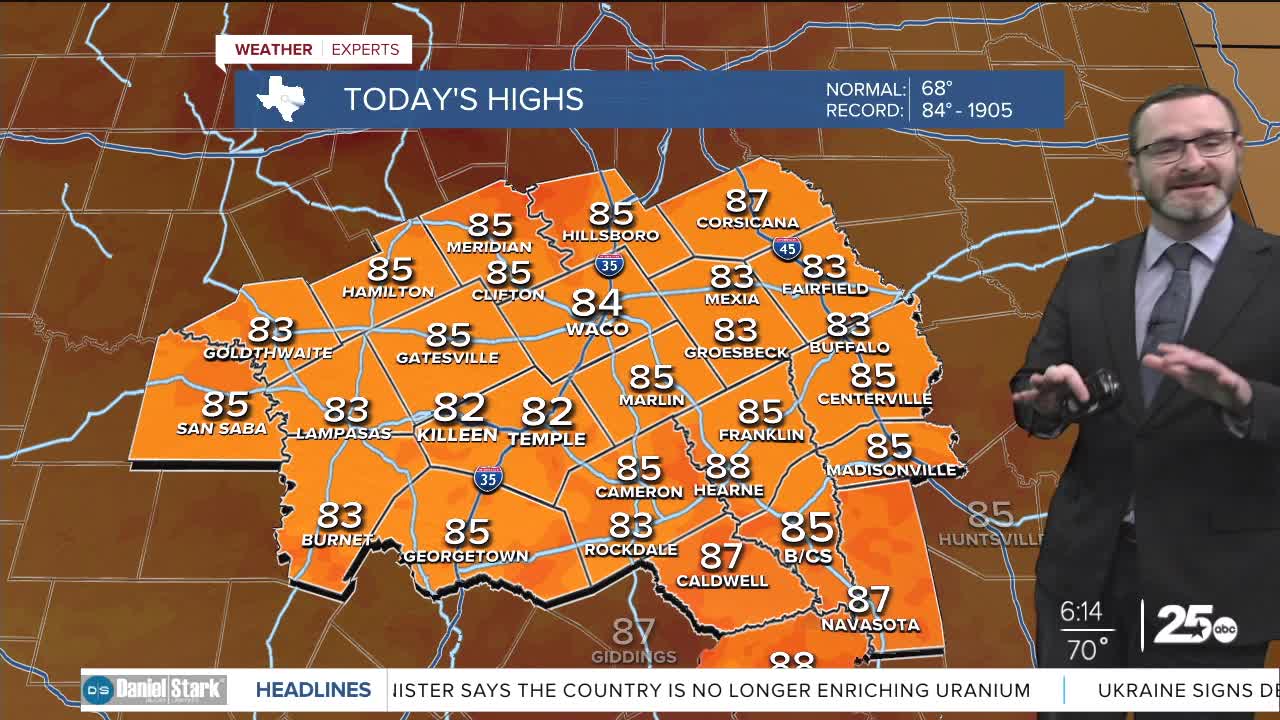CENTRAL TEXAS — Highs will climb into the mid 80s this afternoon with clouds hanging around longer. That will still be near record levels. Storm chances arrive starting tomorrow.