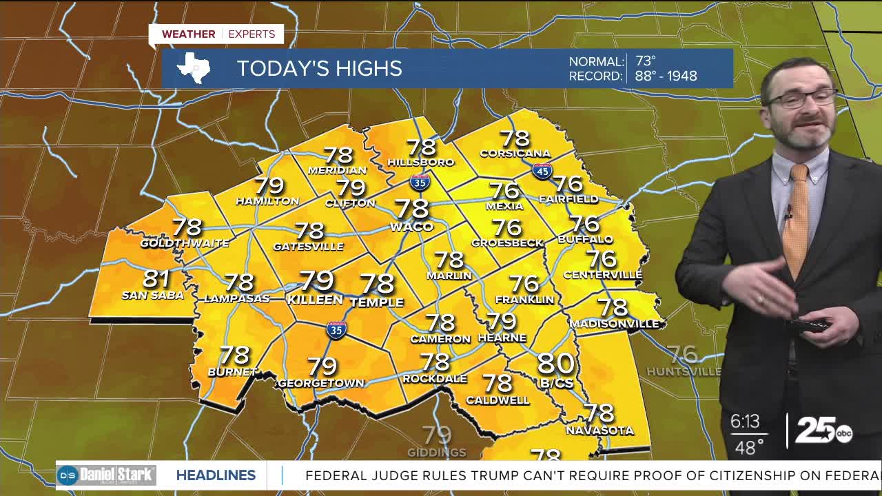 CENTRAL TEXAS — Highs will climb into the upper 70s this afternoon under sunny skies. Expect a more substantial warm-up for the middle and second half of the work week.