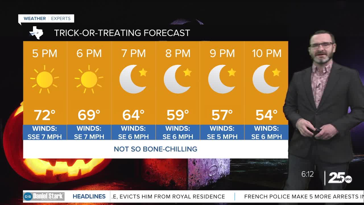 CENTRAL TEXAS — Highs will climb into the low 70s this afternoon under mostly sunny skies. Overnight lows fall into the 40s, but trick-or-treating will be spent in the 60s and 50s!\