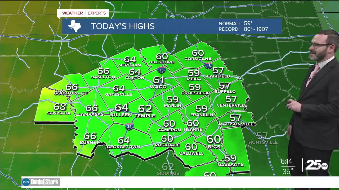 CENTRAL TEXAS — Highs will climb into the low 60s with less wind on the way for Thursday. Another cold front arrives Friday bringing the gusty winds back!
