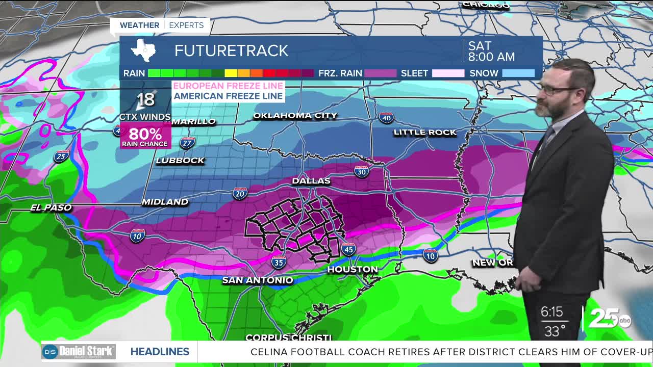 Friday is the day of change here in Central Texas as a strong cold front moves into the Lone Star State. The front should arrive during the middle of the day Friday, but may arrive as early as the morning. Models have sped up the cold air, suggesting that we could see temperatures fall below freezing as early as Friday night. That means that during the day Saturday we will likely see widespread freezing rain mixing with sleet at times. This will lead to icing and travel impacts. It is too early to nail down exact timing and totals, but I'd advise against travel Saturday. There will be a small chance for this to switch over to snow overnight Saturday into Sunday, but the majority of this will fall as ice. Sunday may feature drier conditions, but it will still be below freezing, so travel is not advised. Temperatures may fall into the teens Monday morning, and may finally climb above freezing during the day Monday. Prepare now for these impacts, and the potential for temperatures to remain below freezing for more than 48 hours.