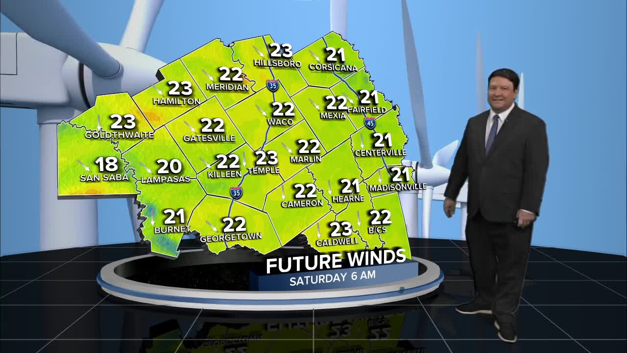 25 EVENING WEATHER — Scattered showers and storms are possible before midnight, but everything should clear out as we move into Saturday morning. Winds will pick up out of the north and northwest at 15-25mph by sunrise, and it will stay windy throughout the day Saturday. It will be cooler, even with sunshine, with highs in the mid to upper 50s. Sunday will start off near freezing as the wind dies down across the area. Sunday afternoon looks nice with highs around 60°.