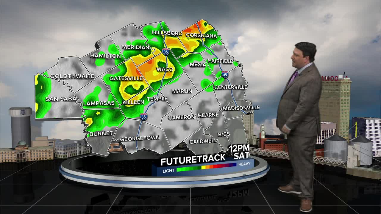 A cold front will race into Central Texas Saturday. This will set the stage for thunderstorm development Saturday morning. A few of these storms may produce large hail and gusty winds. A line of storms should mature along the front by lunchtime into the afternoon hours. These will mainly affect the Brazos Valley. Strong winds and some hail will be possible. Once the front passes, temperatures will fall from the 70s into the 50s and 60s, especially across Central Texas Saturday afternoon. This will limit the severe weather threat, and we will shift to more of a heavy rain threat. On and off scattered showers and storms are expected Saturday night into Sunday morning. Rain chances should taper off through the day Sunday with highs in the mid 60s. Storm totals of 1-2 inches is likely this weekend.