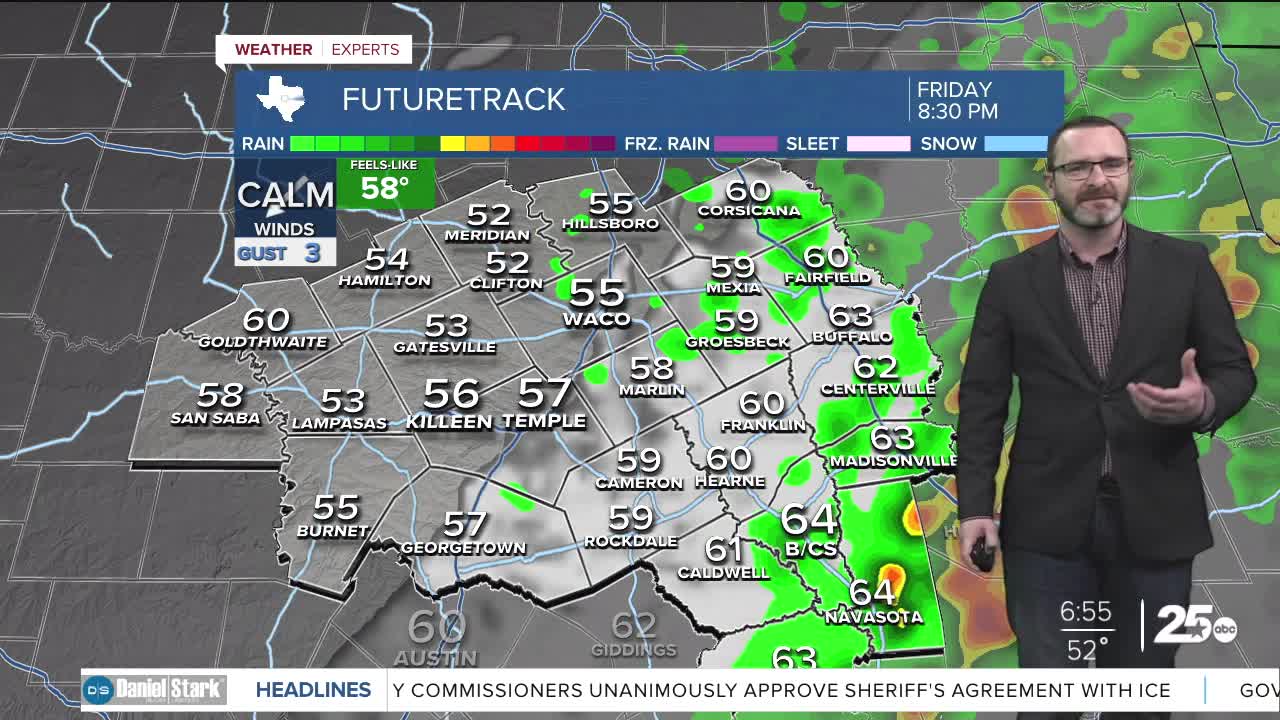 CENTRAL TEXAS — A cold front will work into our area triggering showers and storms by afternoon, especially along and east of I-35. Behind the front, things turn cool for the weekend.