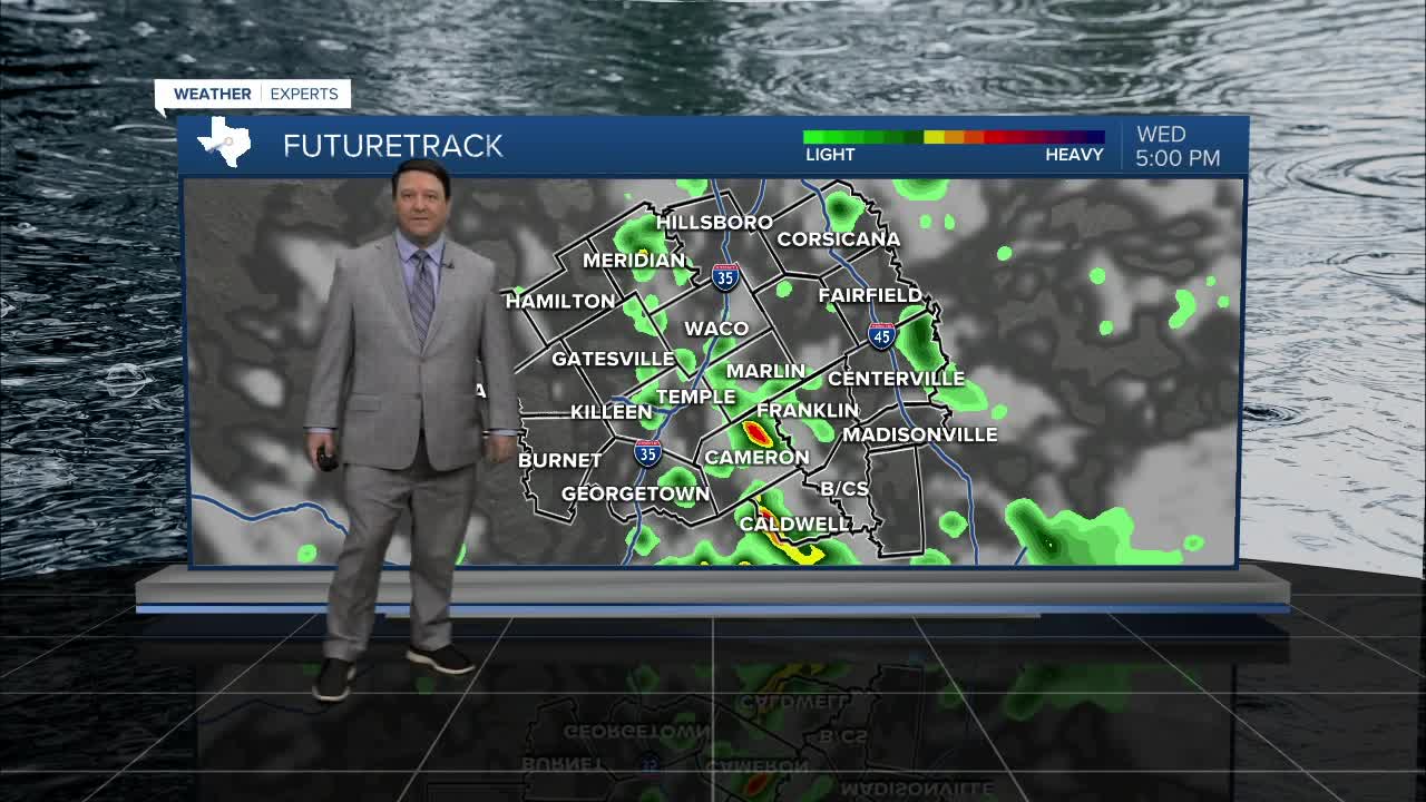 25 EVENING WEATHER — We have seen some rainy conditions on our Wednesday, and that will continue to night into Wednesday morning with some drizzle and fog. Lows will hold steady or fall only a couple of degrees in the low 60s. Wednesday looks mostly cloudy with highs in the upper 70s. There could be a few showers and storms in the afternoon, especially in the Brazos Valley.