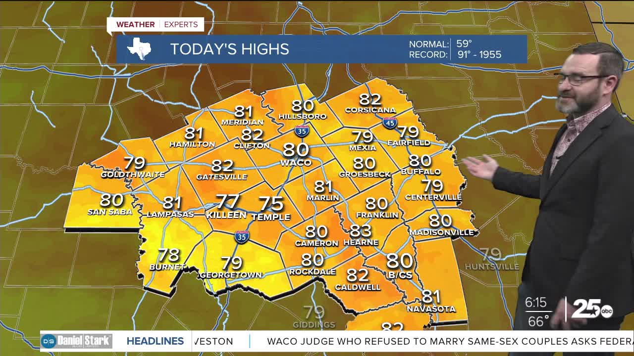 CENTRAL TEXAS — Unseasonably warm weather will continue to hang around today after record-breaking heat yesterday. We'll once again target numbers near 80 this afternoon, but records will stay in tact. That's only because our record high today is in the 90s and was the highest December temperature ever recorded in Central Texas. South breezes will help us get there at 15-20mph.