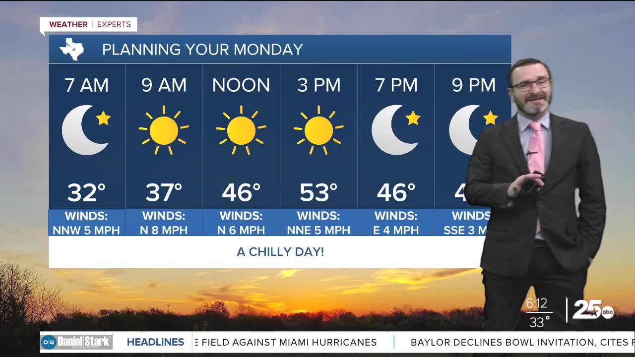 CENTRAL TEXAS — Highs will climb into the low 50s this afternoon despite plenty of sunshine. Watch for a light freeze in spots overnight.