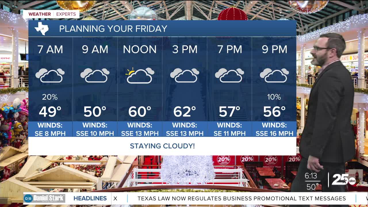 CENTRAL TEXAS — Expect cloudy conditions to hang around through the day today keeping highs in the 50s and the 60s. Storms will be possible tomorrow ahead of a strong cold front.
