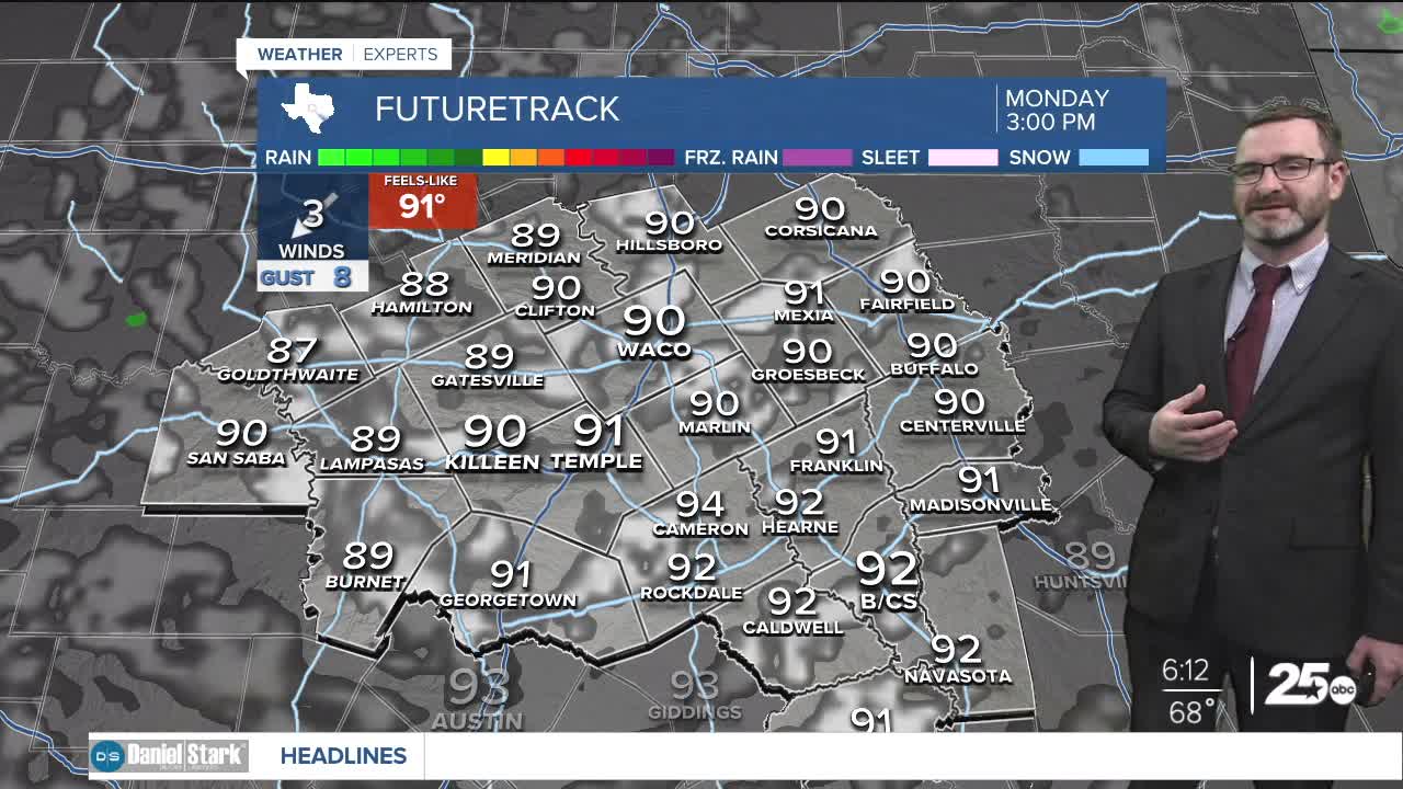 CENTRAL TEXAS — Highs will climb into the low 90s this afternoon under partly cloudy skies. We're tracking a weak cold front for the middle of the week that could bring small rain chances.
