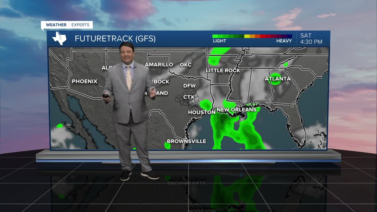 25 EVENING WEATHER — A weak disturbance will move out of the Gulf and into Texas Thursday and Friday. Right now it appears that moisture will be too scarce for showers and storms, so an increase in cloud cover is all we will likely notice. The exception could be down in the Brazos Valley, where a few isolated showers and storms could move in Friday afternoon. Highs still look warm in the upper 80s to near 90°.