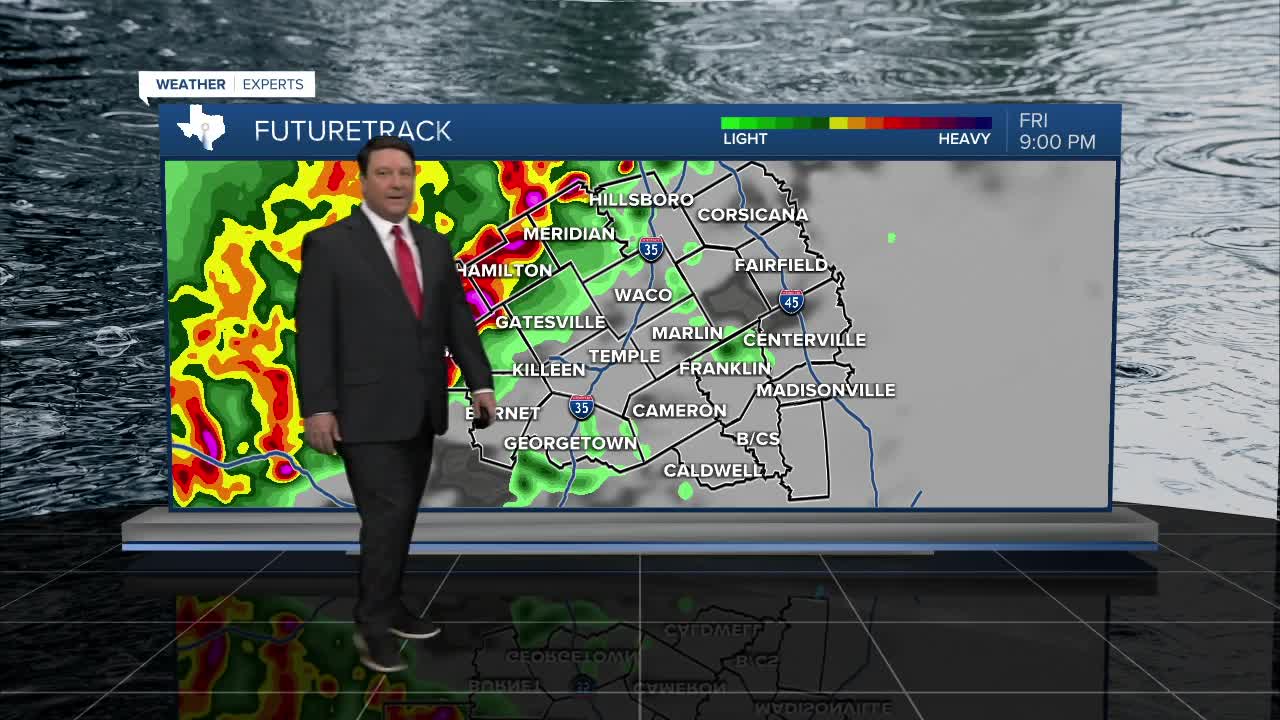 25 EVENING WEATHER — It will be a stormy night across Central Texas. Thunderstorms will start to develop this evening and become more widespread as we head through the overnight hours. A few storms could be severe with pocket change size hail and winds up to 65mph in the strongest storms. There could be a low end tornado threat west of I-35 this evening as well. Storms will start to slowly weaken east of I-35, but some strong wind gusts will be possible through early Saturday morning. There is also the potential for heavy rain. 1-2 inches looks likely, but some isolated areas may see 3-4 inches of rain. That is why a Flood Watch is in effect through Saturday morning across a good portion of Central Texas.