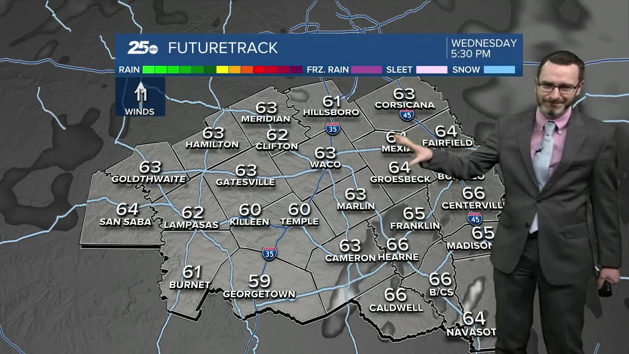 CENTRAL TEXAS — Expect warmer air to funnel on in for Wednesday thanks to a forming low pressure system in the Rockies. That will lead to breezy south winds at around 15-25mph which will continue to bring more warm and humid air in. Highs Wednesday will reach the upper 60s and lower 70s with Partly Sunny skies.