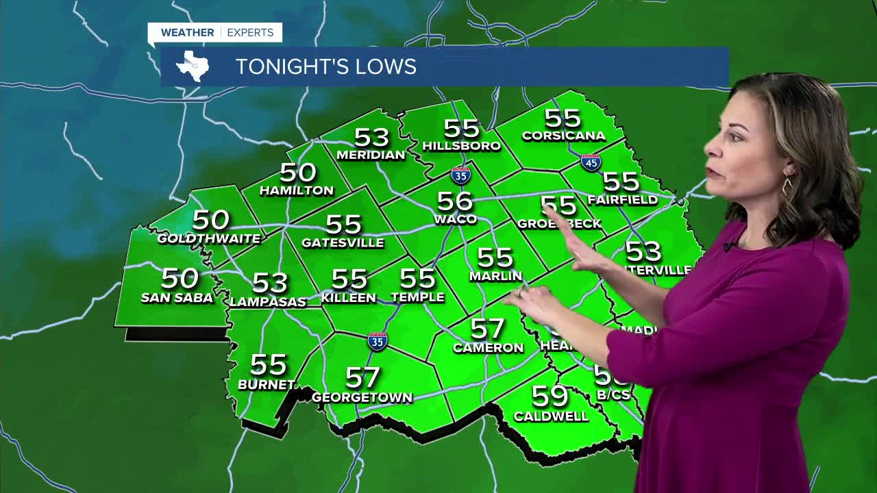 Tomorrow morning will bring a dramatic change from today's start, with wake-up temperatures in the 50s compared to the lower 30s experienced this morning. Northwestern communities will see lows around 50 degrees, while areas along the I-35 corridor will bottom out in the middle 50s. The Brazos Valley will stay warmer, with temperatures closer to 60 degrees.