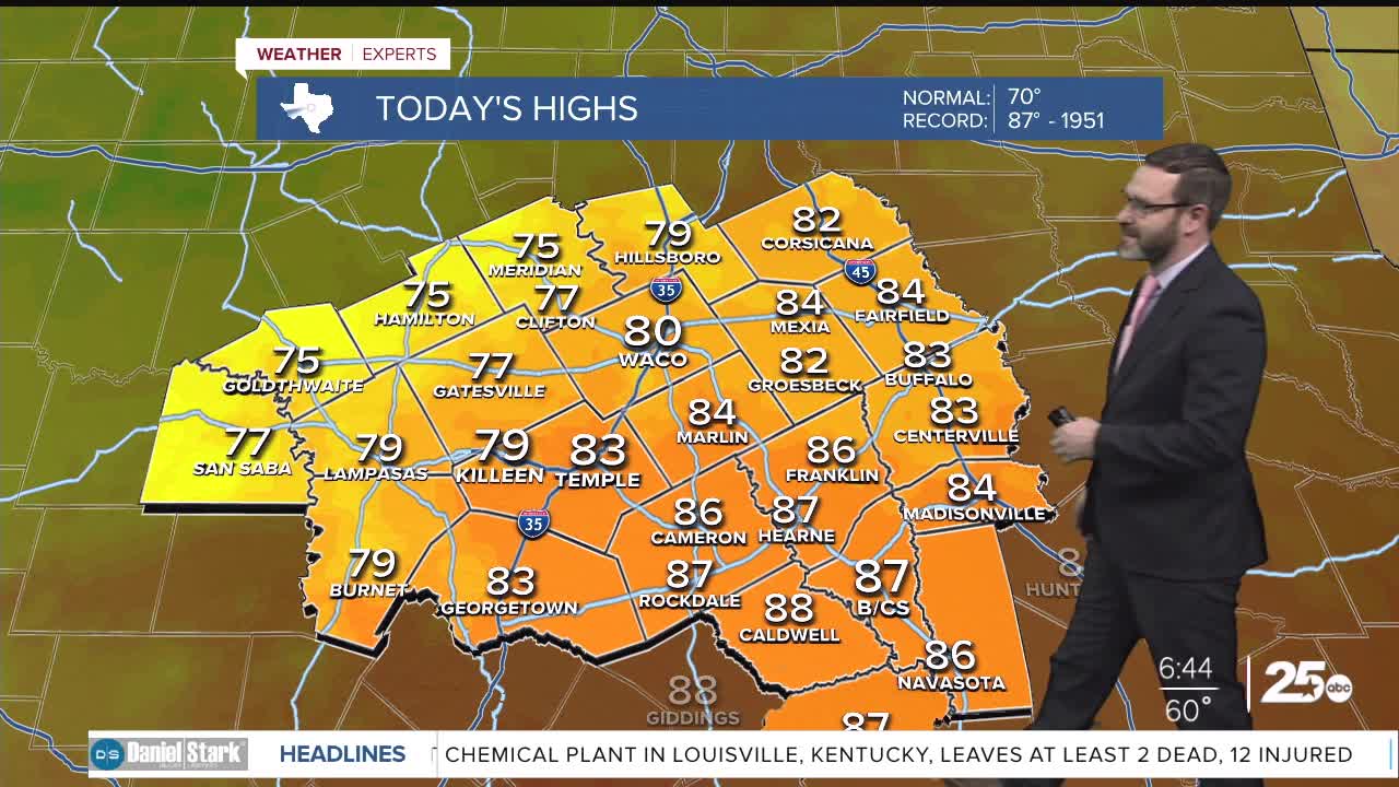 CENTRAL TEXAS — Highs will climb into the low 80s despite a cold front coming through. Cooler temperatures will be around for the second half of the week, but still above normal.